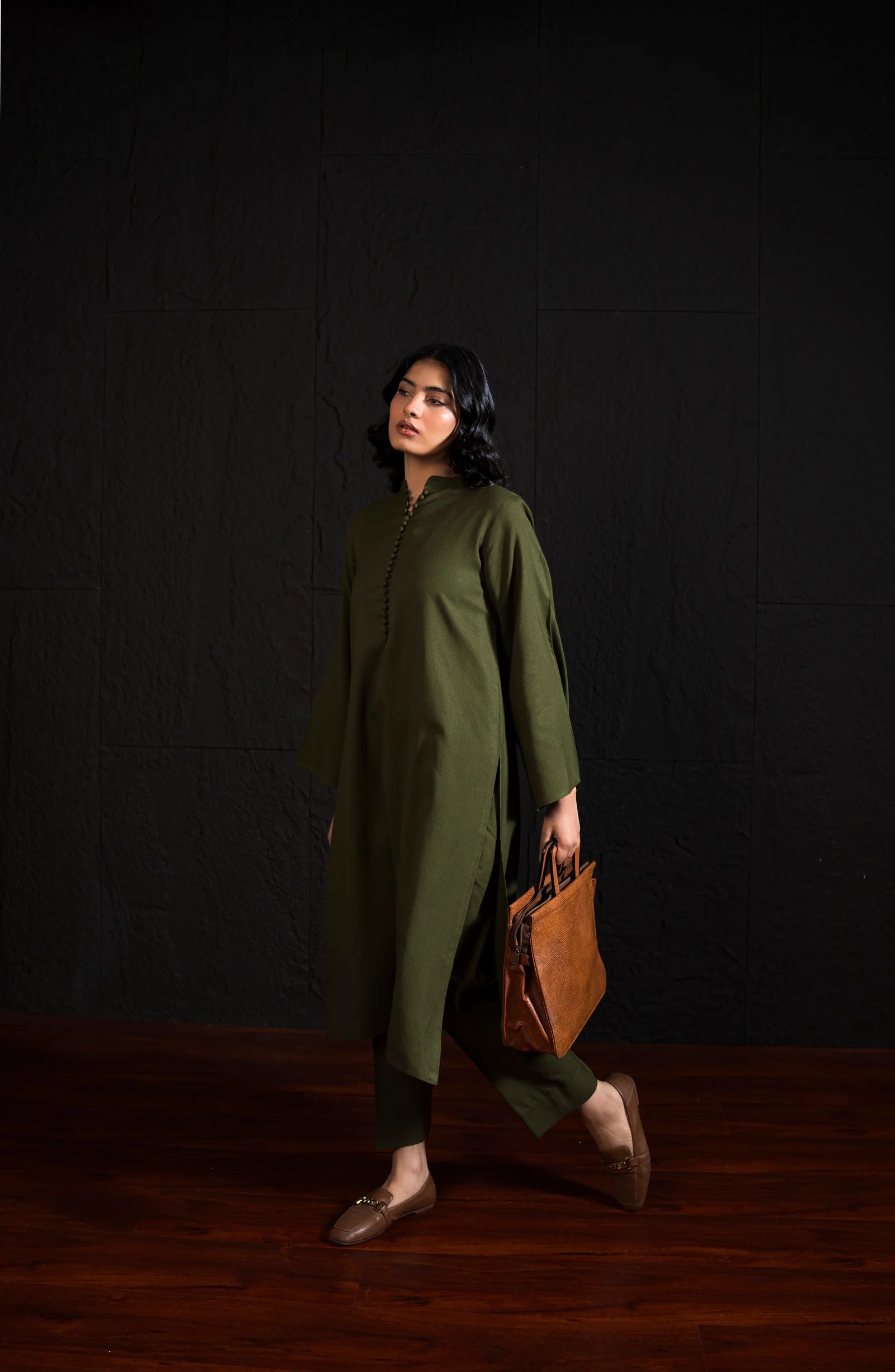 The Olive Co-ord redefines simplicity with its clean silhouette and graceful flow. Designed in an elegant olive hue, it features a longline fit, front button closure, and soft bell sleeves for subtle movement. A statement in minimalism — perfect for elevating everyday moments or refined occasions alike.