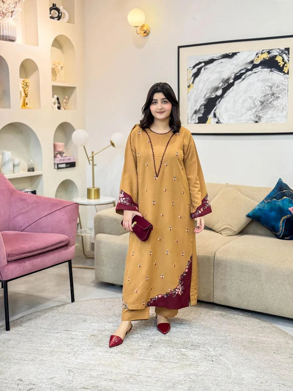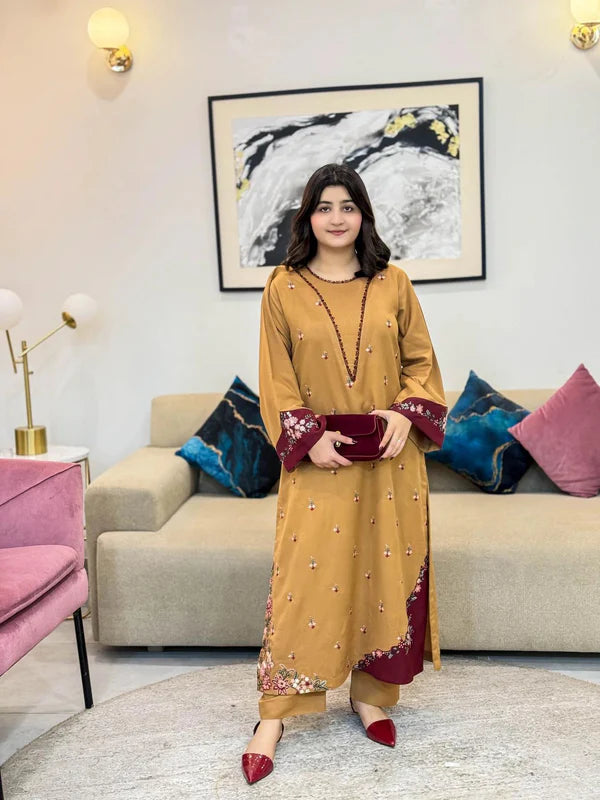 FULLY EMB MEHROON PATCH SHIRT + PLAIN TROUSER