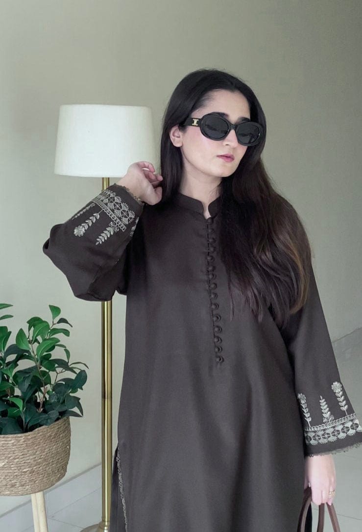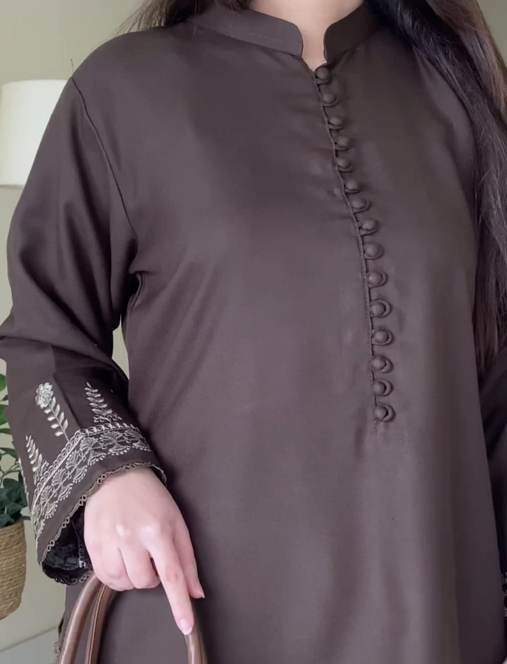 This ensemble is a soft nude beige co-ord set made from lightweight georgette fabric giving a smooth and elegant drape.The top has a minimalist straight-cut silhouette with v shaped neckline and wide sleeves,offering a relaxed yet refined look.The loose flowy trouser complement the top maintining a balanced and chic look
