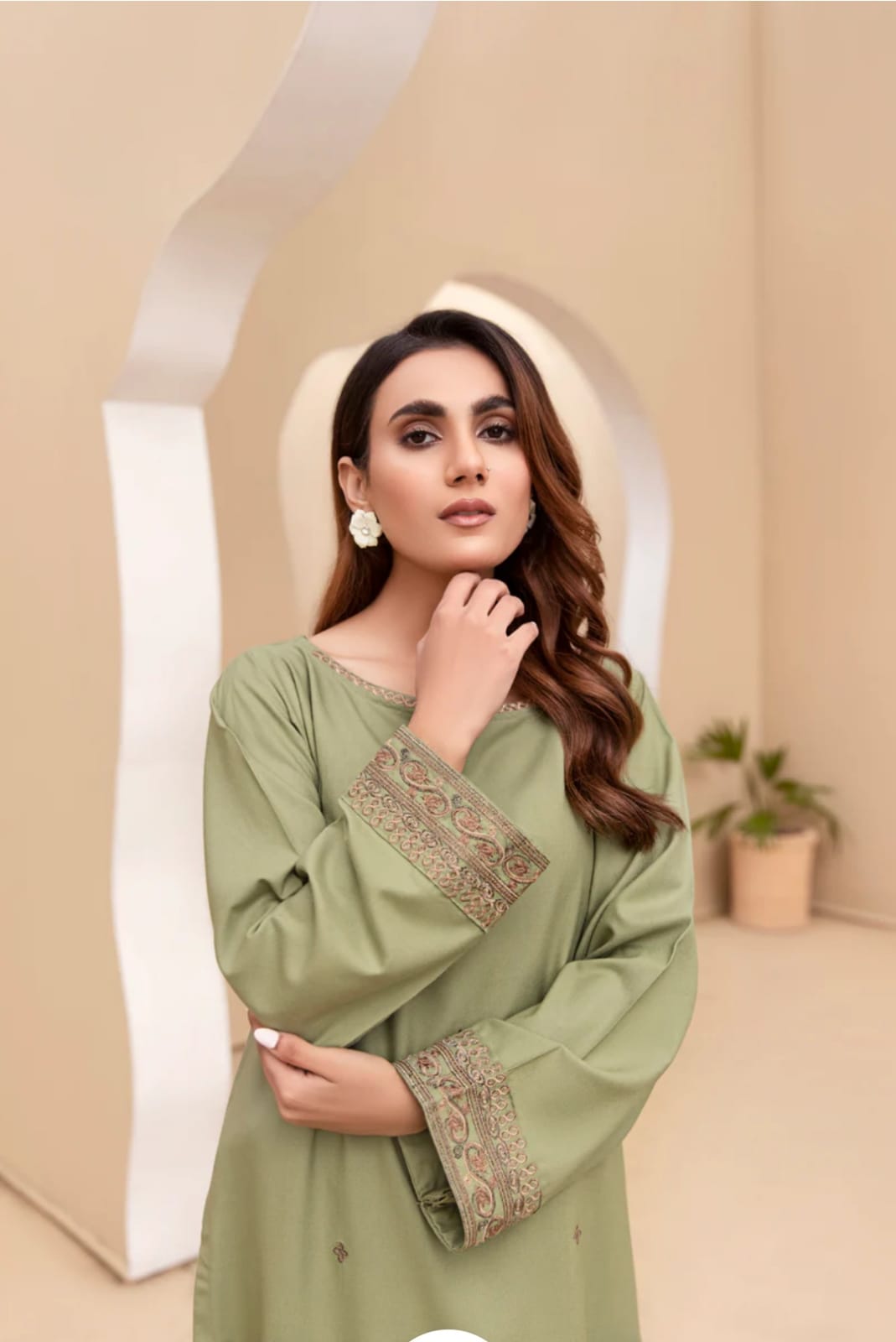 This ensemble is a soft nude beige co-ord set made from lightweight georgette fabric giving a smooth and elegant drape.The top has a minimalist straight-cut silhouette with v shaped neckline and wide sleeves,offering a relaxed yet refined look.The loose flowy trouser complement the top maintining a balanced and chic look